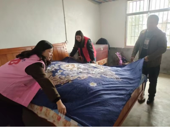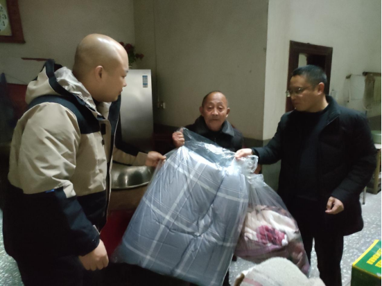 长平乡组织干部、志愿者走访独居老人等特殊群体,了解生产生活情况,送去被褥等御寒物资。