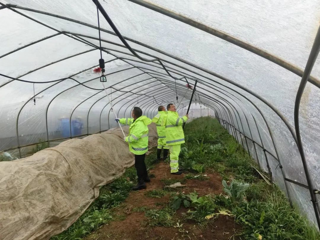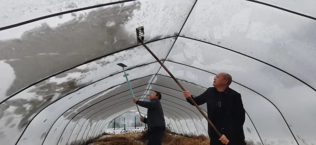 金山镇、东源乡组织党员干部和志愿者在蔬菜种植基地帮助农户清除积雪,保护蔬菜大棚,开展生产自救。