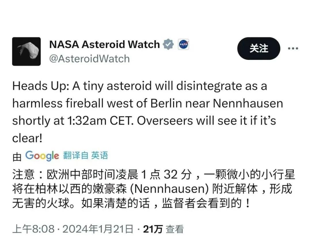 欧洲中部时间1月21日,来自于美国国家航天局行星防御协调办公室的消息称,一颗微小的小行星将在德国柏林以西嫩豪森附近进入地球大气后解体,并发布了行星预警,确定这颗小行星将坠落到德国柏林西部嫩豪森地区附近。