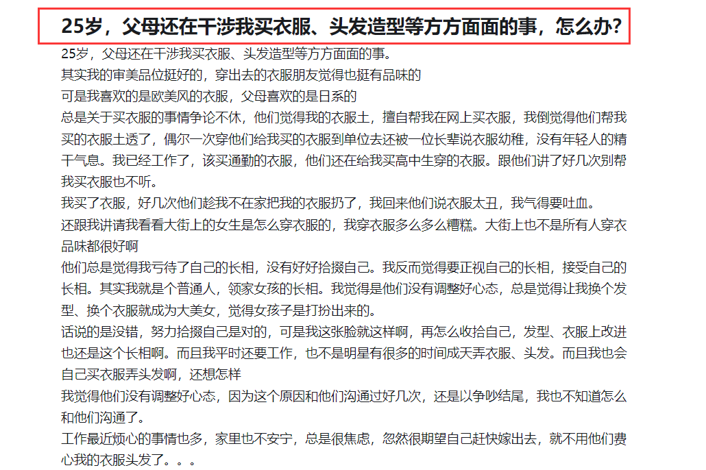 有一个女孩说自己都已经25岁,大学毕业了,无论自己穿衣服,还是说话的方式,甚至是发型,父母都要管。她现在觉得,也许只有自己结婚了,才不用父母再操心,自己叠衣服和头发了。