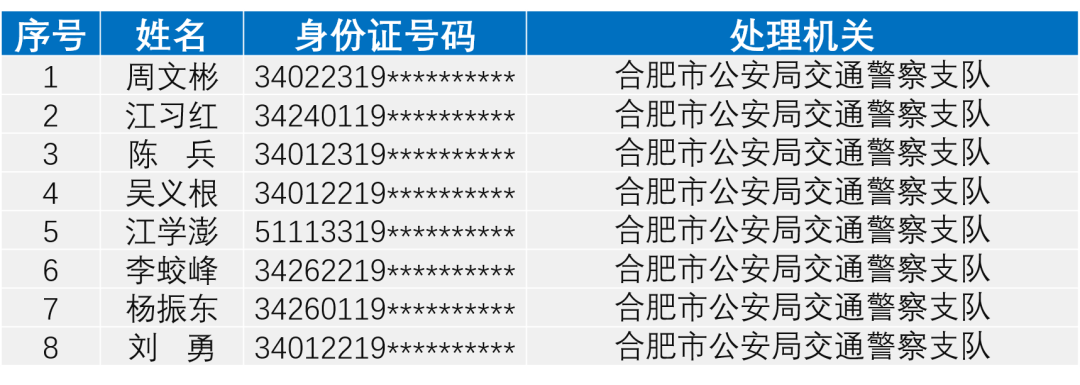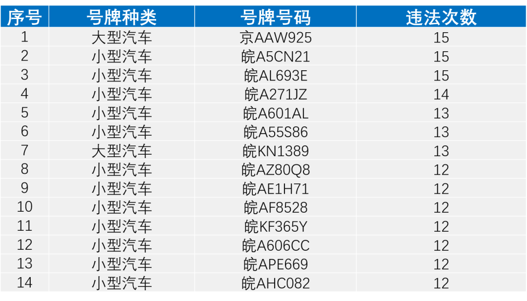 为有效预防和减少道路交通事故,营造平安畅通的道路交通环境,合肥市公安局交警支队向社会公布全市2023年12月份终生禁驾人员名单、非现场处罚违法车辆TOP10等。