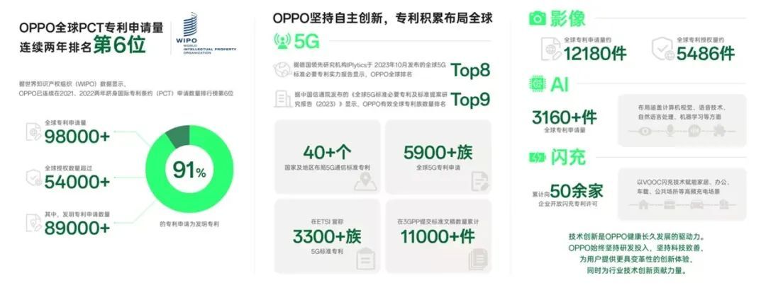 OPPO公布的数据显示,截至2023年12月31日,OPPO在全球40多个国家和地区布局5G通信标准专利,共完成5900+族全球专利申请,在ETSI声明3300+族5G标准专利,在3GPP提交标准文稿数量累计超过11000件。