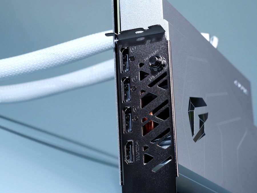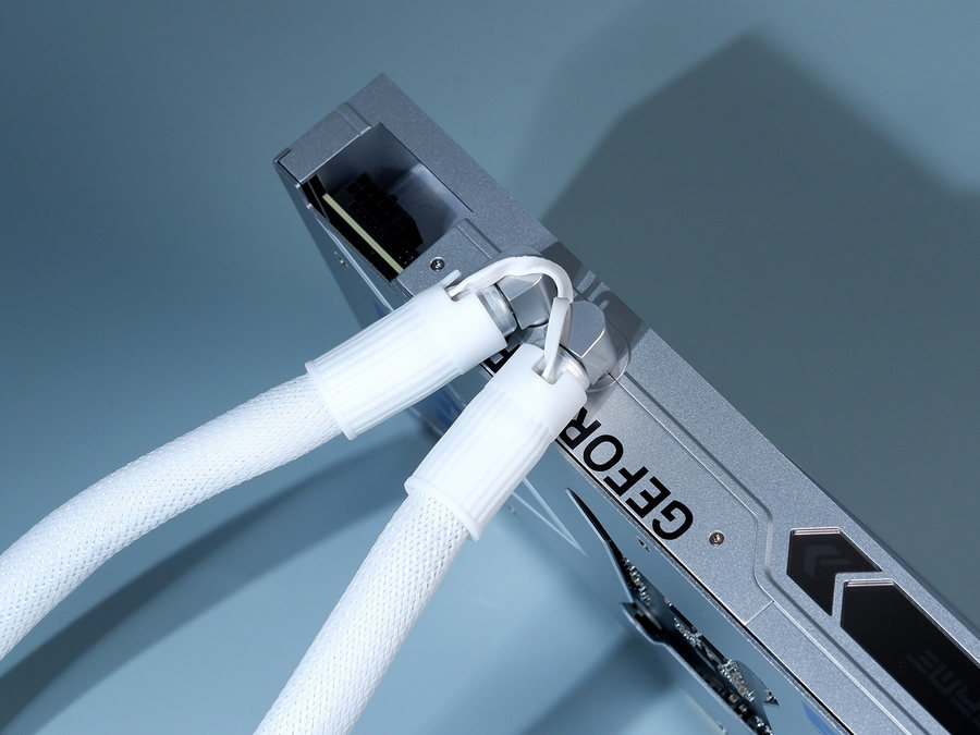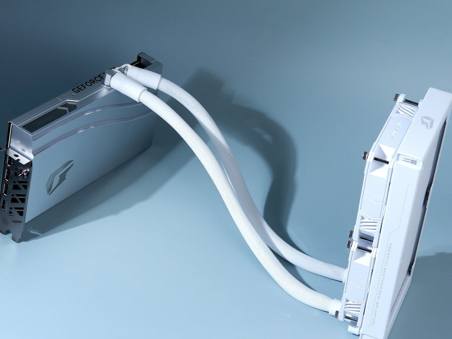 这款显卡采用了两根很粗的水冷管,蛇皮网包裹,柔性较好。同时水冷管长度较长,达到了42cm。等等这些,同样能够提升这款显卡安装的兼容性和便捷性。