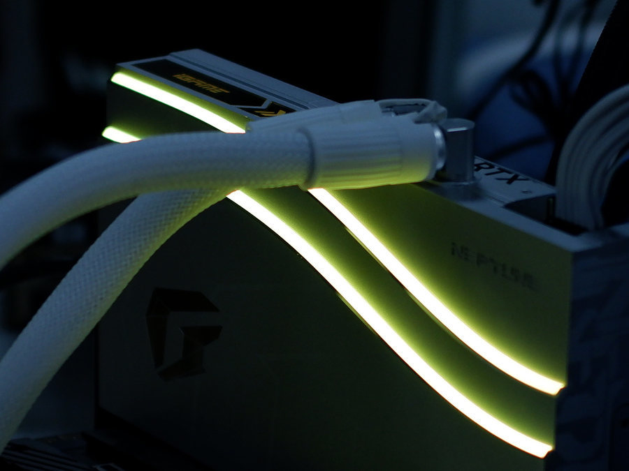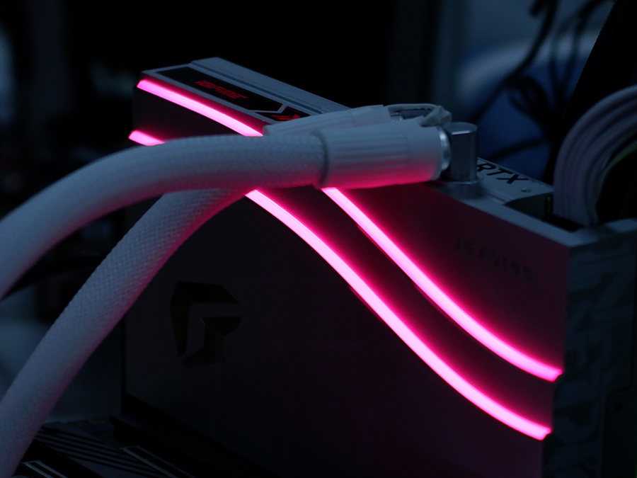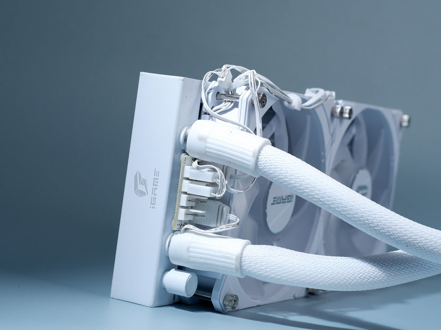 这款水神显卡有一个非常值得笔者表扬的地方,那就是它的线缆集成度非常高。市面上很多水冷散热器,往往设计了较多的线缆,往往需要把专用的线缆插在主板特定的接针上,令线缆裸露在机箱内部,看上去很不美观。
