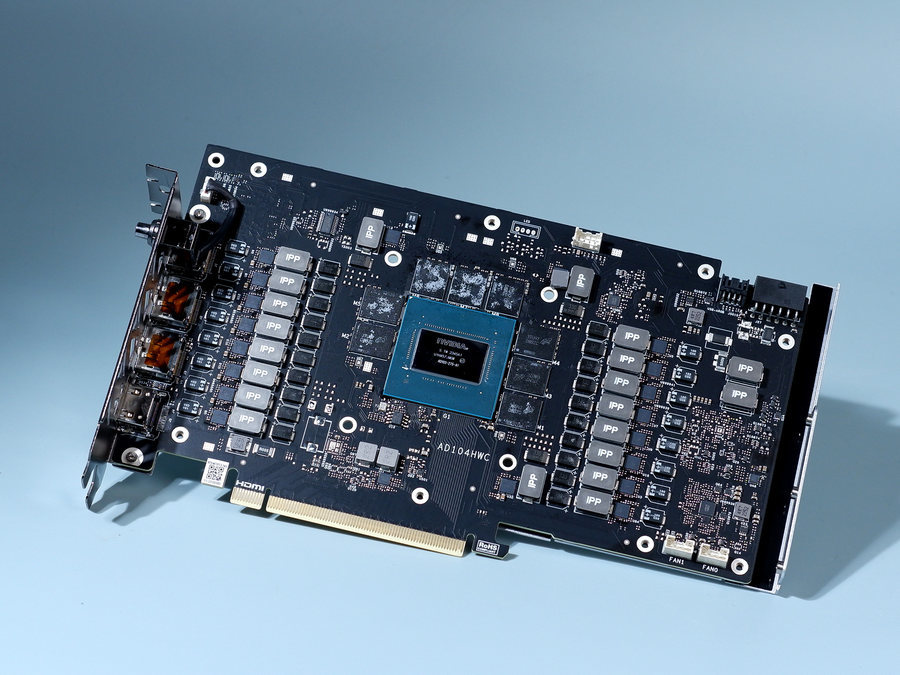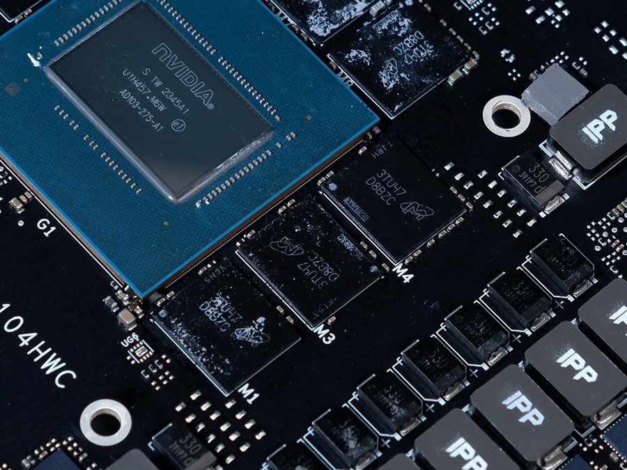 显存是来自美光的GDDR6X,单颗2GB容量。这款显卡PCB正面共设计有8颗显存,组建了16GB显存容量。