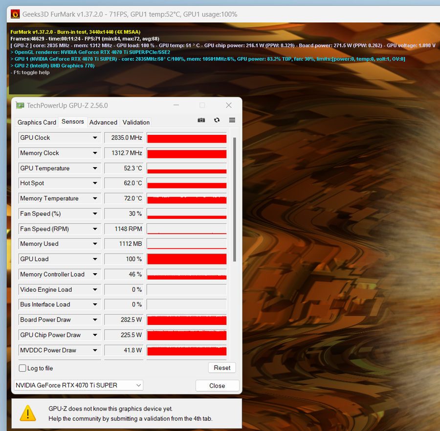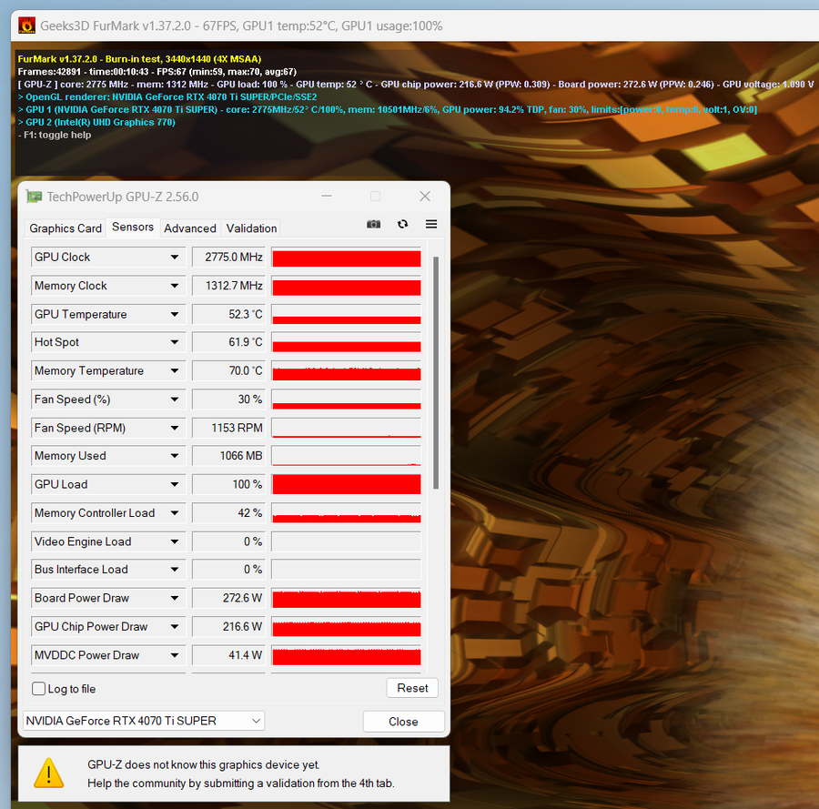 利用FurMark,笔者将对这款iGame GeForce RTX 4070 Ti SUPER Neptune OC 16GB显卡进行压力测试。