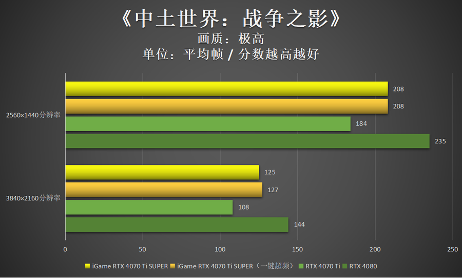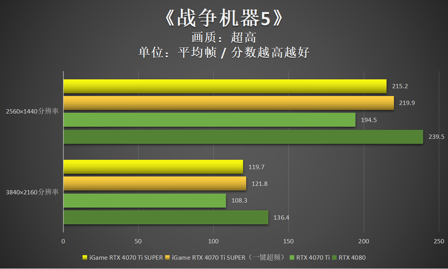 显而易见,iGame GeForce RTX 4070 Ti SUPER Neptune OC 16GB(默频)的游戏性能已明显要好于RTX 4070 Ti。通过iGame一键超频,还能够带来进一步的性能提升。