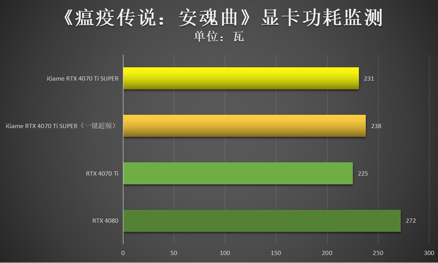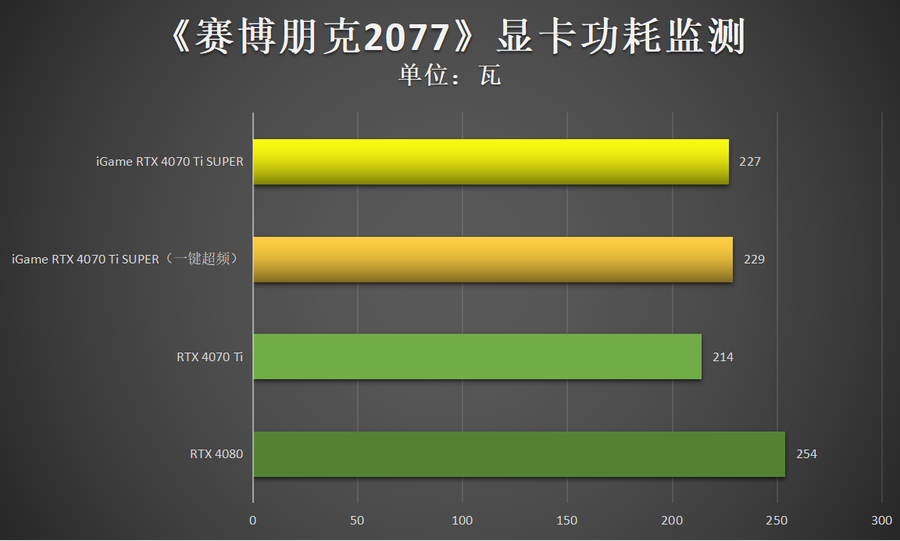 通过实测来看,实际游戏过程中,iGame GeForce RTX 4070 Ti SUPER Neptune OC 16GB的运行功耗普遍控制在了230W左右,即使在iGame一键超频状态下也是如此,功耗表现值得表扬。