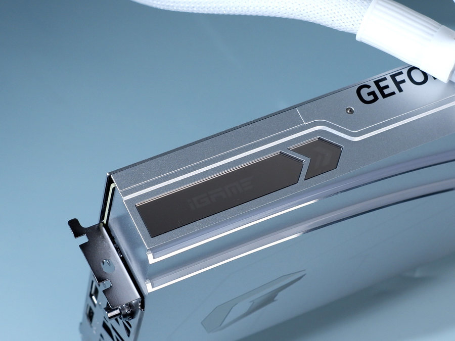 显卡顶部为水冷管的接口端。此外显卡顶部还设计有iGame RGB灯效模块,在显卡运行时能够点亮iGame,点亮属于iGame的玩家信仰。
