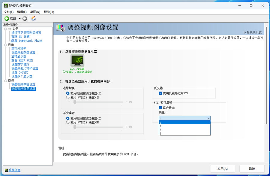 NVIDIA在2023年推出了一项重磅更新——RTX Video Super Resolution,这一项功能翻译过来就是视频超分辨率技术,简称VSR。它可以允许用户在播放视频时,以GPU配备的Tensor Core以及强悍的AI算力来进行内容的计算,从而提升画面分辨率,带来至高4K分辨率视频输出,为用户带来视频观感的提升。