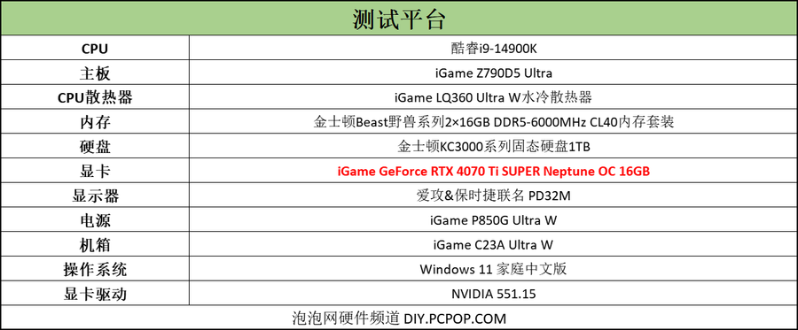 笔者组建了一套性能出色酷睿i9-14900K测试平台,用来测试显卡性能。为了对比iGame GeForce RTX 4070 Ti SUPER Neptune OC 16GB的性能,笔者此次测试还加入RTX 4070 Ti以及RTX 4080的成绩。