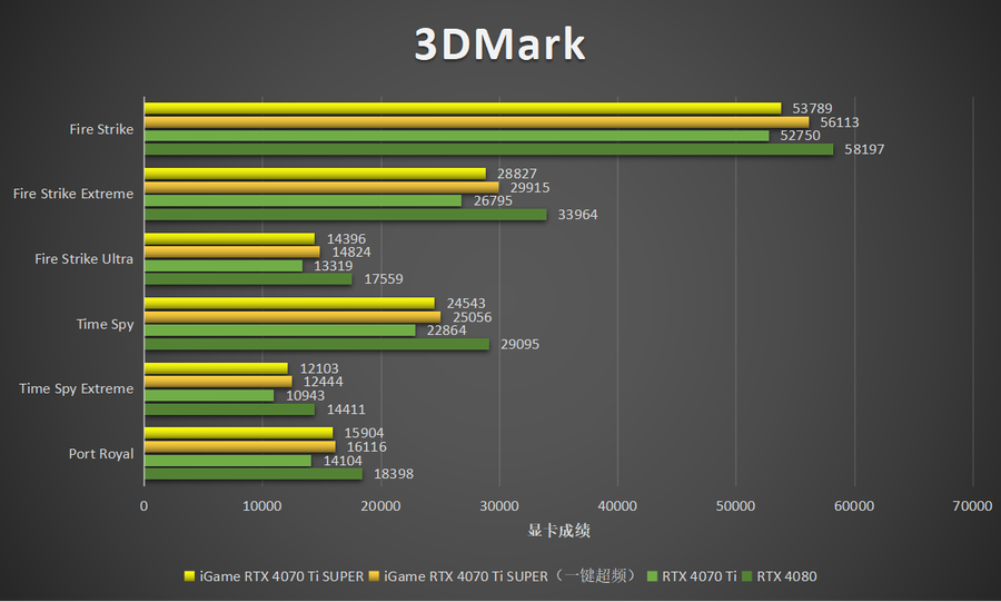 在3DMark Time Spy测试项目中,iGame GeForce RTX 4070 Ti SUPER Neptune OC 16GB(默频)的性能约为RTX 4070 Ti的107%。