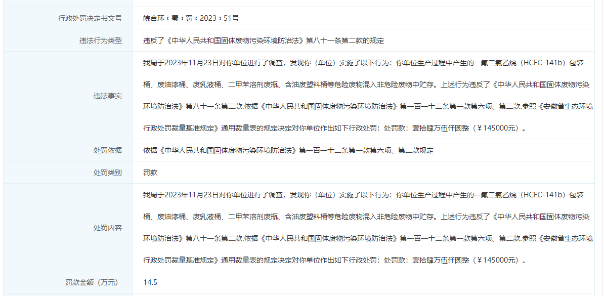 合肥市蜀山区生态环境分局发布的行政处罚书(皖合环﹝蜀﹞罚﹝2023﹞51号)内容显示,我局于2023年11月23日对你单位进行了调查,发现你(单位)实施了以下行为:你单位生产过程中产生的一氟二氯乙烷(HCFC-141b)包装桶、废油漆桶、废乳液桶、二甲苯溶剂废瓶、含油废塑料桶等危险废物,混入非危险废物中贮存。