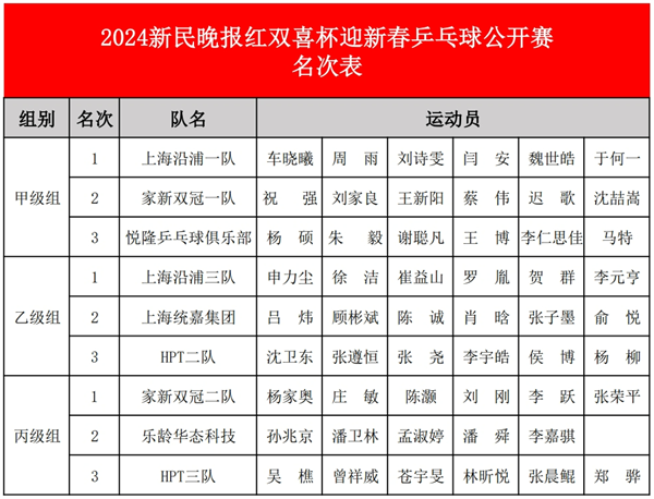 亚军家新双冠俱乐部,是近年来新民晚报红双喜杯上一支新晋的强队,由毕业于华东理工大学的全国大学生冠军刘家良领衔。“越来越多专业选手加入新民晚报红双喜杯,比赛不好打。”刘家良坦言,“但我们和前国手比赛,有时候也会赢,这就是乒乓球的魅力。”