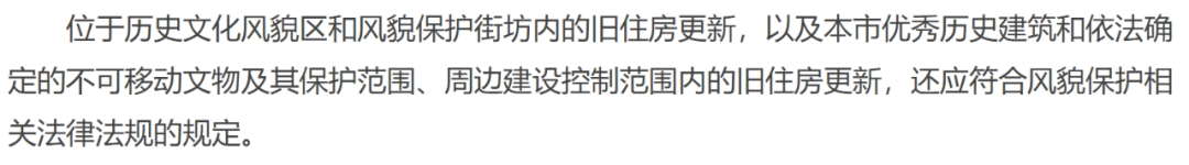 规定了位于历史文化风貌区和风貌保护街坊内的旧住房更新,应当符合风貌保护相关法律法规的规定
