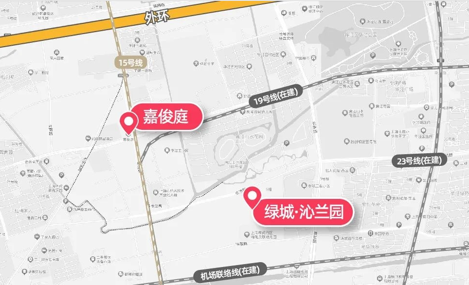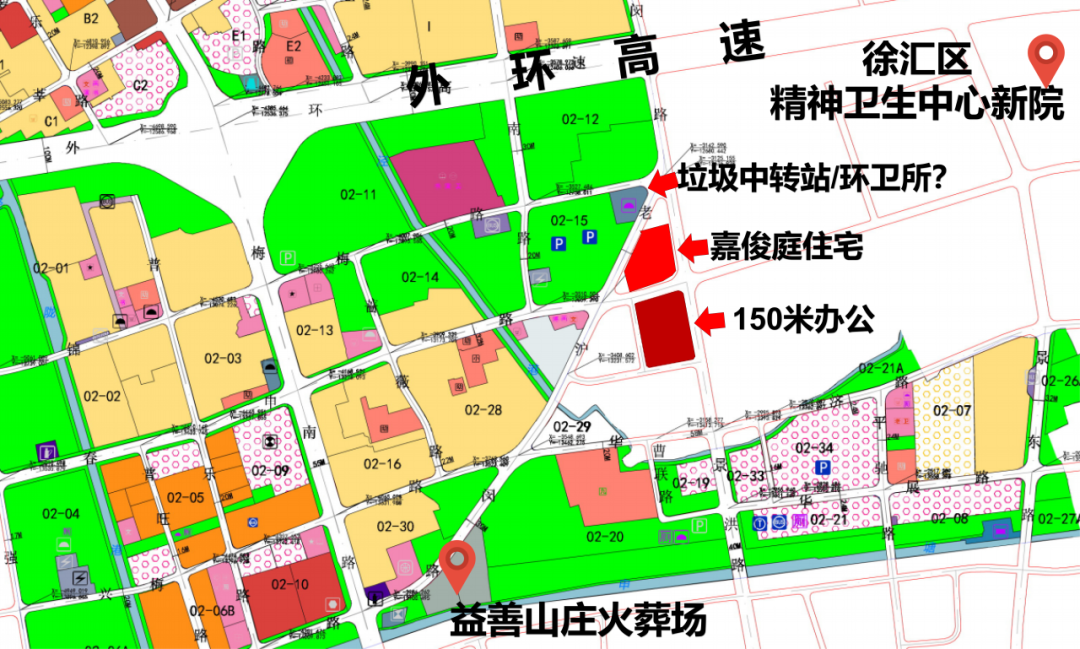 小区外部不利因素也有点多,东北方向800米左右的距离,是徐汇精神卫生中心新院;西南方向约1.3公里处,是殡仪馆益善山庄;南侧是150米高层商务办公地标,采光可能受影响;西北侧的一块环境卫生设施用地也存在不确定因素。