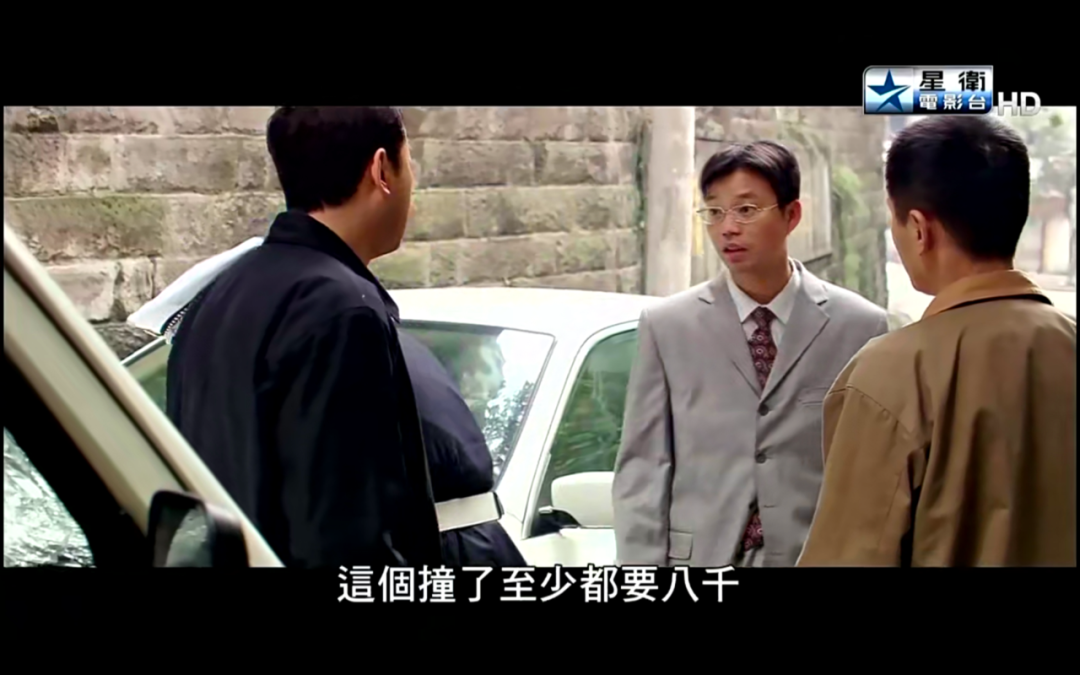 宝马车主四眼(王迅饰)向包世宏索赔8000块。