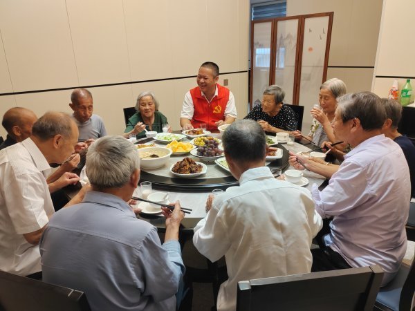 建德村干部陪老人在食堂吃桌餐,了解民意。建德市委组织部供图