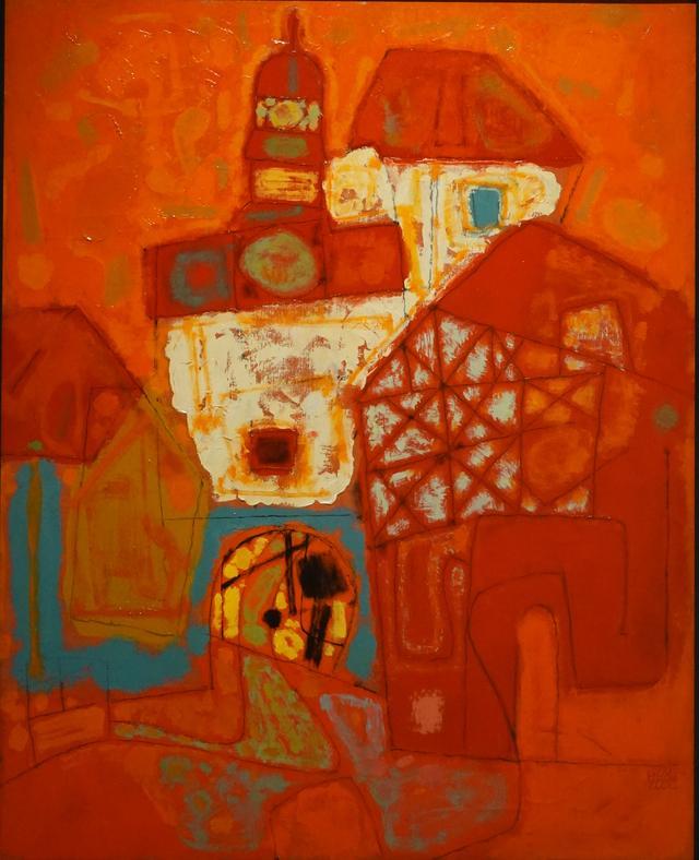许明耀的作品《晨曦》是一件非常赏心悦目的抽象画作品,画面满是灼热的光感和热烈的橙红色,恍惚间有一种惊艳、神秘的感觉。虽然这张画是平面的,但在画前会发现是它是有深度、有想象力的。这种因人而异的不同想象力会带来不同的感觉和体验,唯一不变的就是这件作品传递的热情。简单的大色块对比着相互映衬,简洁的线条在关键结构上的点缀,显示了画家对色彩对造型的深刻理解,看似拙朴实则精妙。
