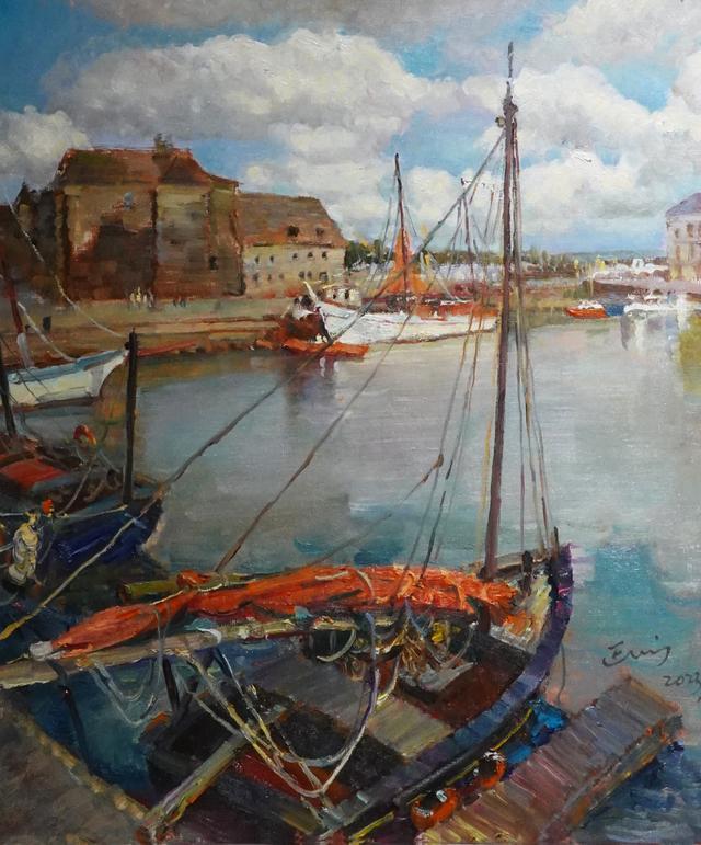 殷正洲的作品《塞纳河上的港湾小镇》是一幅功底扎实的写实绘画作品。画家用他擅长的绘画语言把充满阳光的法国小镇那种宁静、慵懒的节奏表现得淋漓尽致,也把塞纳河边的漂亮颜色表现的恰如其分。白云和河影,驳船和教堂,阳光和春风都在画中轻轻流动,令人心驰神往,很有代入感,让人不由自主地想去远方、去画中的那个地方。