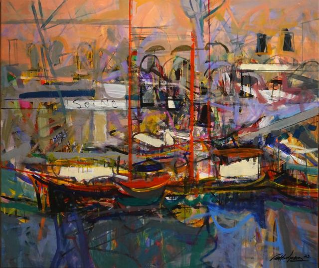沈勇的作品《塞纳河上的一条船》取材于塞纳河岸的一条普通的驳船。但是那条船的颜色有点特别,黑色的船体,朱红的桅杆、白色的船舱,黄色的船线紧紧地扣住了画家的视线。沈勇以他一贯的表现主义的自信和洒脱画出了他心目中的塞纳河。画面暖和华丽的基调,变幻多样的随意涂抹勾勒,好像融入了塞纳河畔特有的浪漫情绪,也融入了画家心底里的激情与感悟。