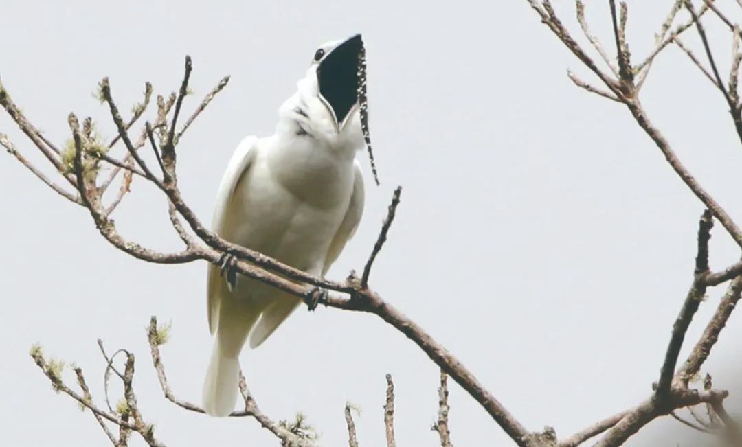 雄性白岭鸟全身覆盖着雪白的羽毛,它有着一双黑眼睛,嘴巴是暗银色的,嘴巴上面还挂着一根由黑白两色点缀的粗羽毛。雄白岭鸟长着一幅绅士的外表,不过它的声音一点也不绅士,因为雄白岭鸟不久前被生物学家授予了“叫声最响的鸟”的头衔。