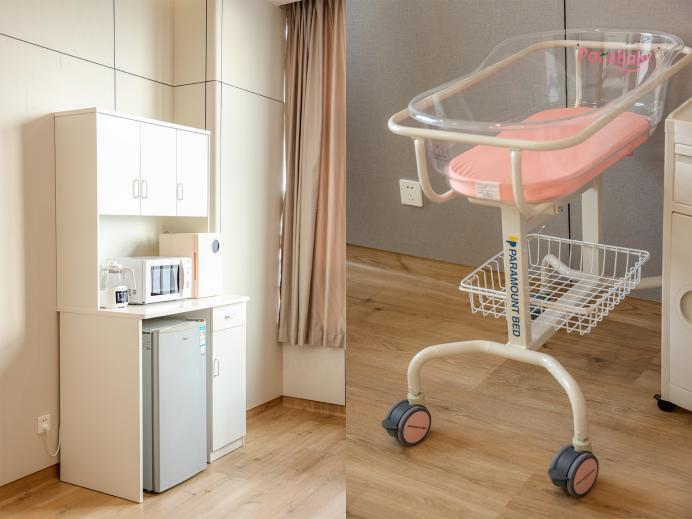 走进产科家化病房,温馨舒适、宽敞明亮的病房环境给人眼前一亮的感觉。不同于普通病房,家化病房设施齐全,配有高级电动产病一体床,能满足产妇不同的分娩体位,促进自然分娩。还配有床旁胎心监护仪、保暖床等医疗设备,冰箱、微波炉、电视、陪人床、沙发、奶瓶消毒柜、温奶器、高级哺乳椅、哺乳枕、豪华婴儿床等设施,允许家人24小时陪伴,像在家里一样舒适。
