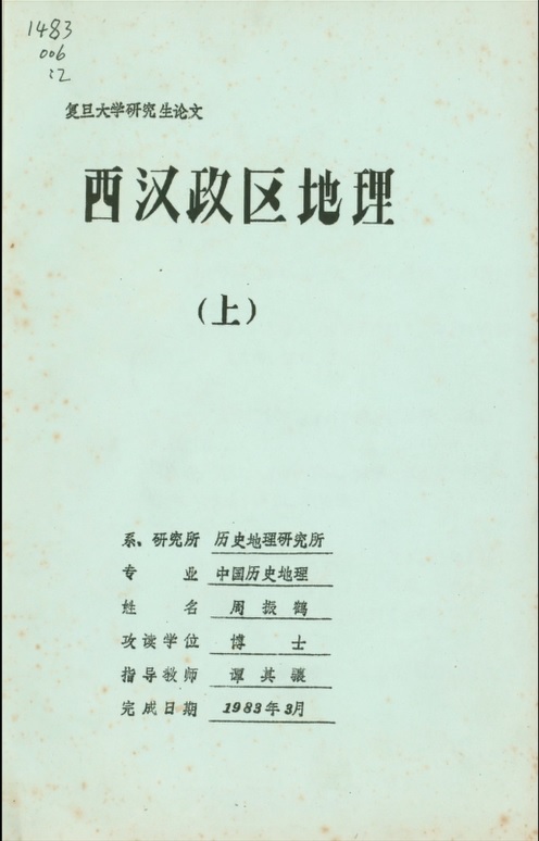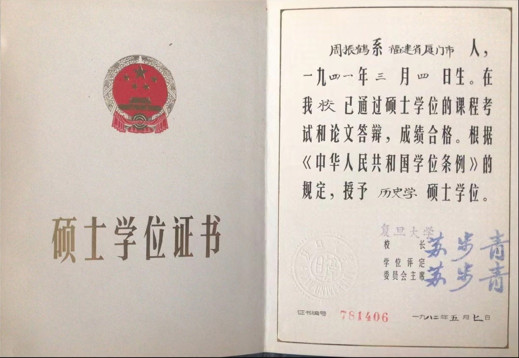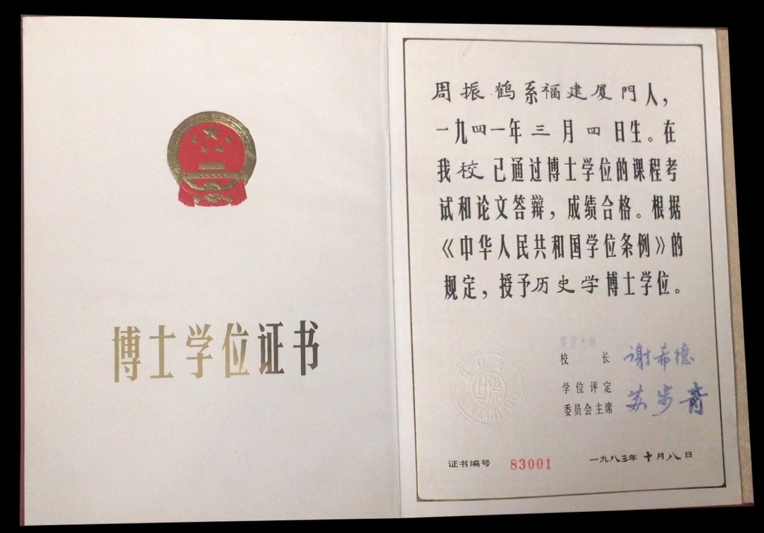 博士阶段,周振鹤将西汉一代全部疆域的政区变迁过程作为研究对象,于1983年上半年完成博士论文,定名为《西汉政区地理》。此后“政区地理”一语遂成为正式学术概念。博士论文答辩获全票通过后,10月19日复旦大学举行授予博士学位证书仪式,周振鹤成为了全国最早的两名文科博士之一,此后一直留在复旦史地所,为学从教至今。