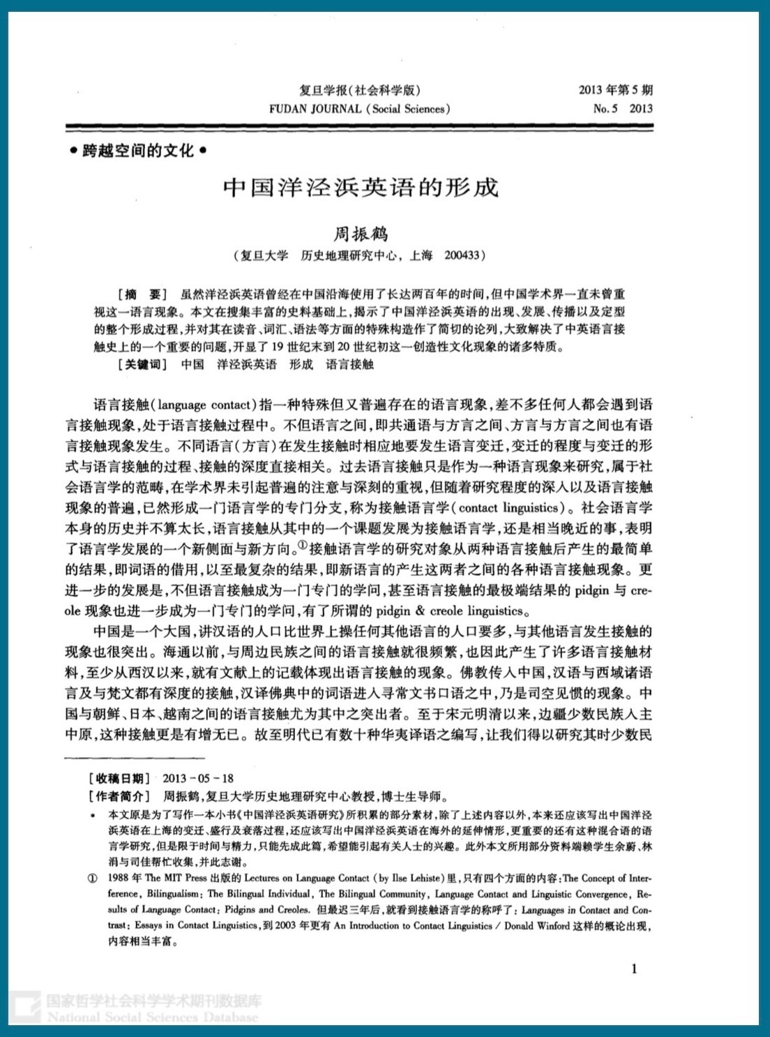 中国的洋泾浜英语在中国沿海地区存在了两百年之久,而且实际上是大航海时代以来由于语言接触所产生的,林林总总的洋泾浜语言(pidgin language)中非常重要的一种,就连pidgin一词也应该是产生于中国的。但中国学术界对于这一重要的文化现象的研究基本上处于空白状态,外国学者有过一些研究,但基本上不为中国学术界所知。而中国方面的某些文献因为不常见,不但为外国研究者所不知,也为本国学者所忽略。其实这一研究至少有两方面的意义,不但在于语言学方面,还在于历史学方面,因为这一语言现象同时又是历史上一种特殊的文化现象。 ——《中国洋泾浜英语的形成》(《复旦学报》,2013年)