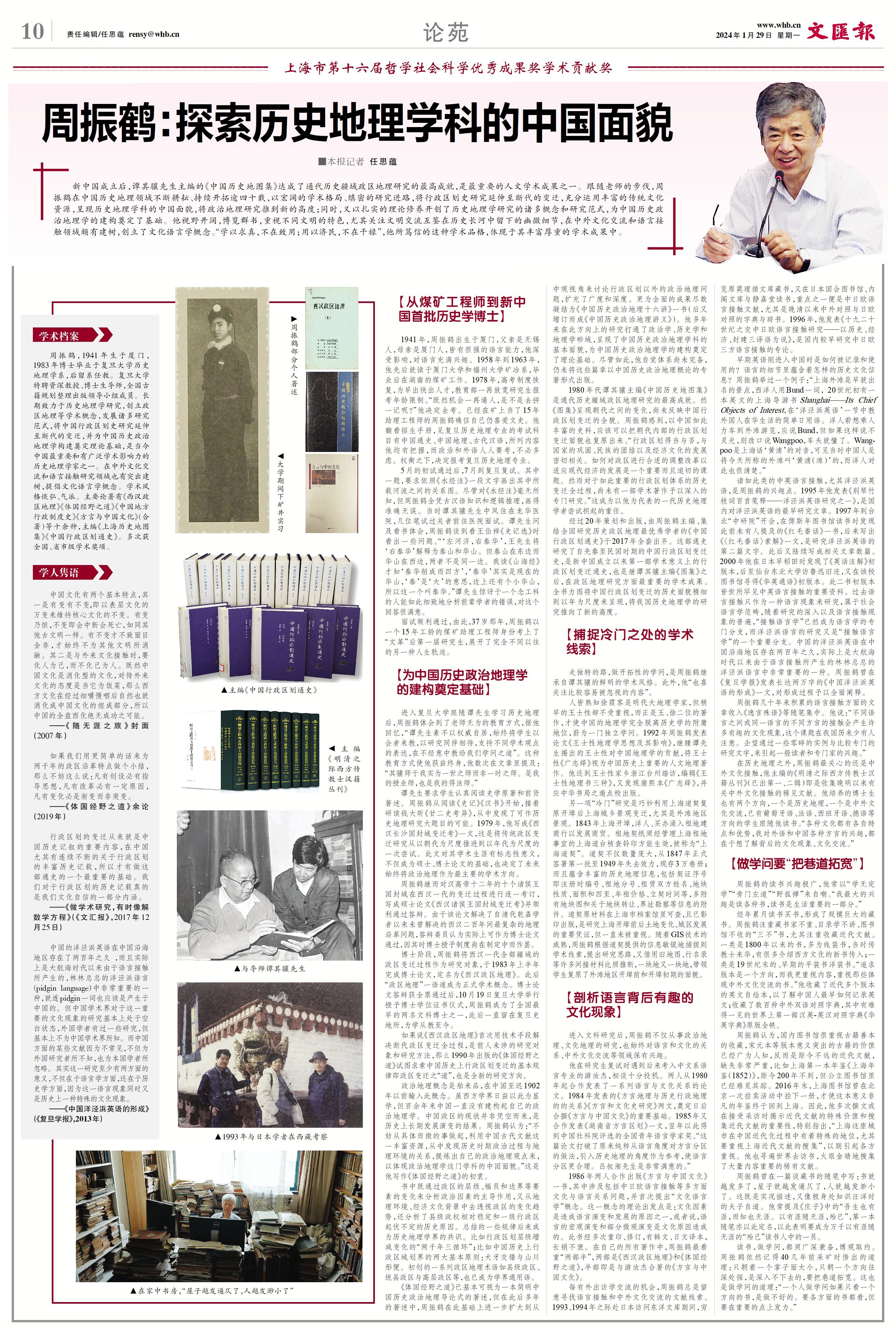 新中国成立后,谭其骧先生主编的《中国历史地图集》达成了通代历史疆域政区地理研究的最高成就,是最重要的人文学术成果之一。跟随老师的步伐,周振鹤在中国历史地理领域不断耕耘、持续开拓逾四十载,以宏阔的学术格局、缜密的研究进路,将行政区划史研究延伸至断代的变迁,充分运用丰富的传统文化资源,呈现历史地理学科的中国面貌,将政治地理研究推到新的高度;同时,又以扎实的理论修养开创了历史地理学研究的诸多概念和研究范式,为中国历史政治地理学的建构奠定了基础。他视野开阔,博览群书,重视不同文明的特色,尤其关注文明交流互鉴在历史长河中留下的幽微细节,在中外文化交流和语言接触领域颇有建树,创立了文化语言学概念。“学以求真,不在致用;用以济民,不在干禄”,他所笃信的这种学术品格,体现于其丰富厚重的学术成果中。