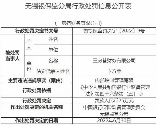 作为集团内财务公司,三房巷财务有限公司在市场上声音不多。2022年6月,原无锡银保监分局对三房巷财务有限公司罚款25万元,理由是该公司存在内部控制管理薄弱的问题。