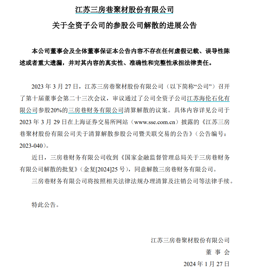 1月26日晚间,三房巷发布关于全资子公司的参股公司解散的进展公告。三房巷称,三房巷财务有限公司收到《国家金融监督管理总局关于三房巷财务有限公司解散的批复》,将按照相关法律法规办理清算及注销公司等法律手续。