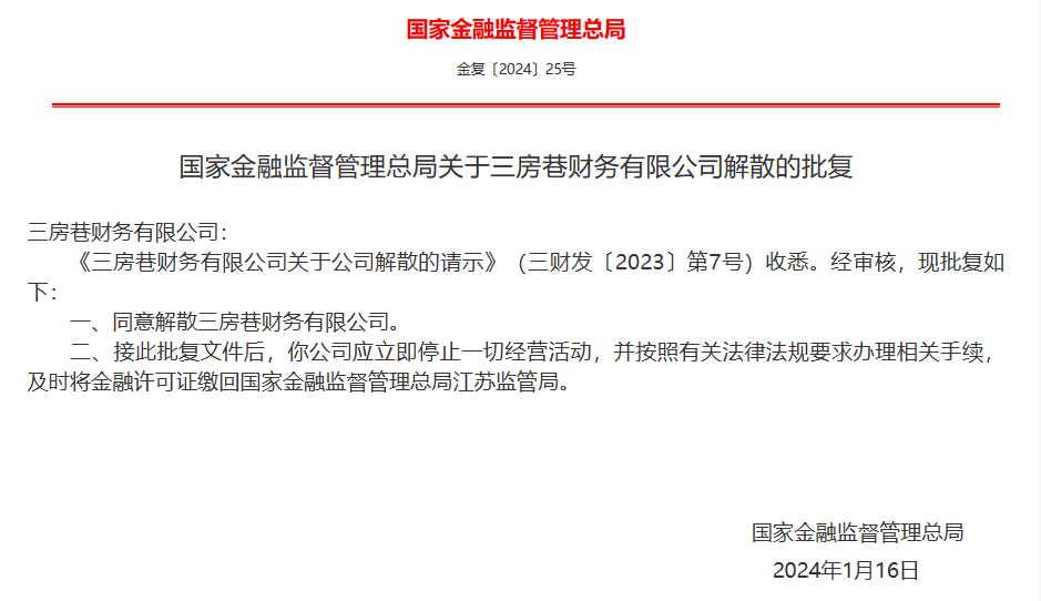 金融监管总局称,《三房巷财务有限公司关于公司解散的请示》(三财发〔2023〕第7号)收悉。经审核,现批复如下: