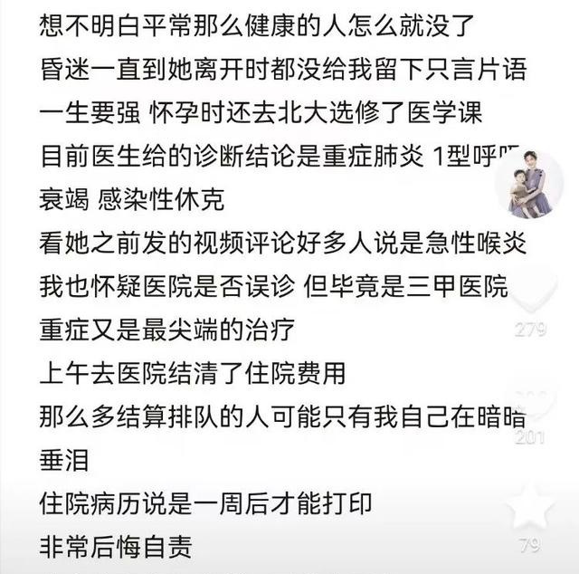 1月27日,该账号再次发文称,“周五周六媳妇的身体状况未见异常,周日她测体温发烧38度7,她想挺着坚持给孩子母乳喂养……周一下午她体力有点不支,傍晚看她有些虚脱,晚上8点我说咱别挺着了赶紧去医院……周二医生说要镇静麻醉上呼吸机转重症监护……症状一直没有好转迹象,然后深度昏迷,历经6次抢救最终没能挽救回来。”