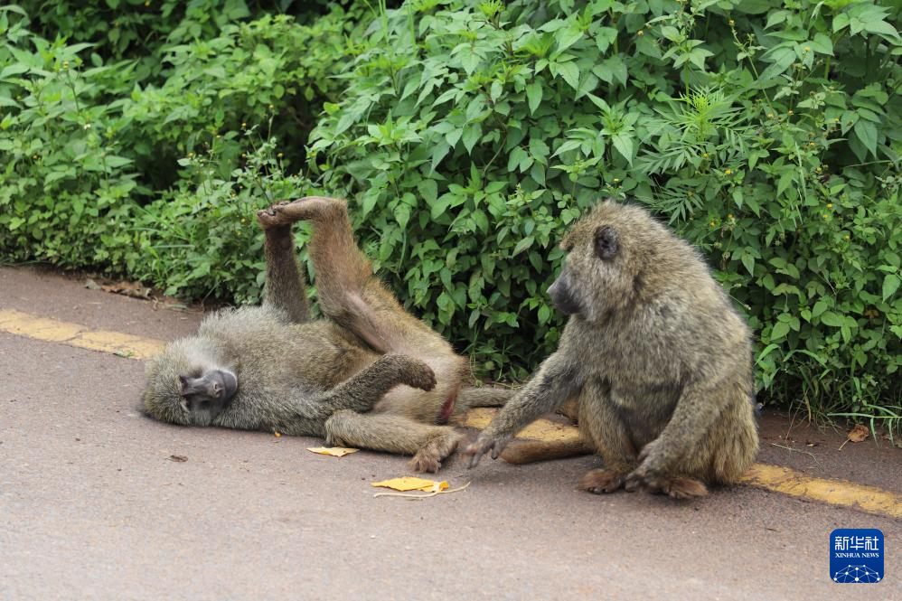 1月29日,两只狒狒在坦桑尼亚恩戈罗恩戈罗自然保护区嬉戏。