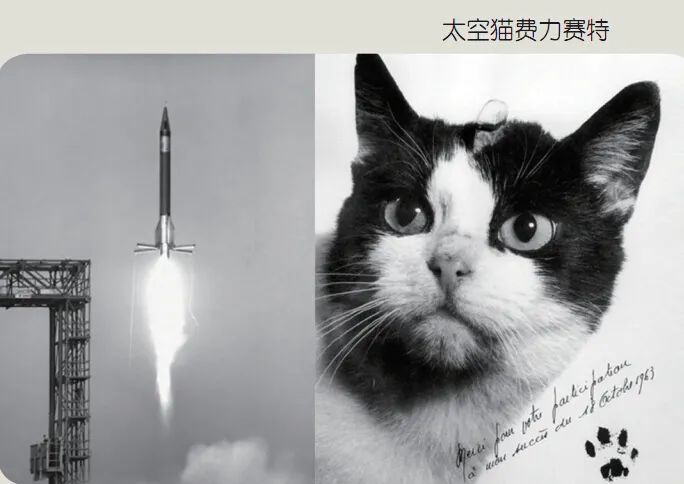 第一只太空猫的名字叫做费力赛特。法国科学家在1963年10月把费力赛特送上了太空,他们不仅在费力赛特的头骨上植入了电极以收集数据,还在它的脚底施加电脉冲以刺激它进行反应。这只猫虽然安全回到了地球,不过在两个月之后被安乐死,然后被科学家解剖,以研究它的大脑。