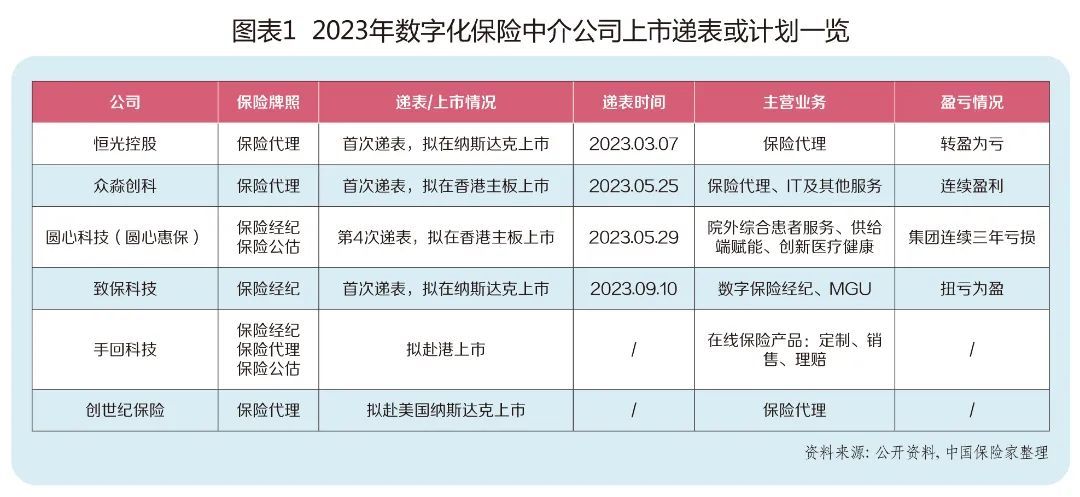 2023年,保险中介递表数量明显增多。11月,创世纪保险举行纳斯达克上市启动仪式。年初恒光保险进行第三次递表,众淼创科、致保科技、圆心科技接连冲击IPO。