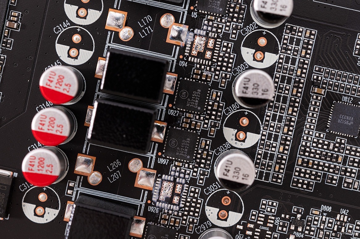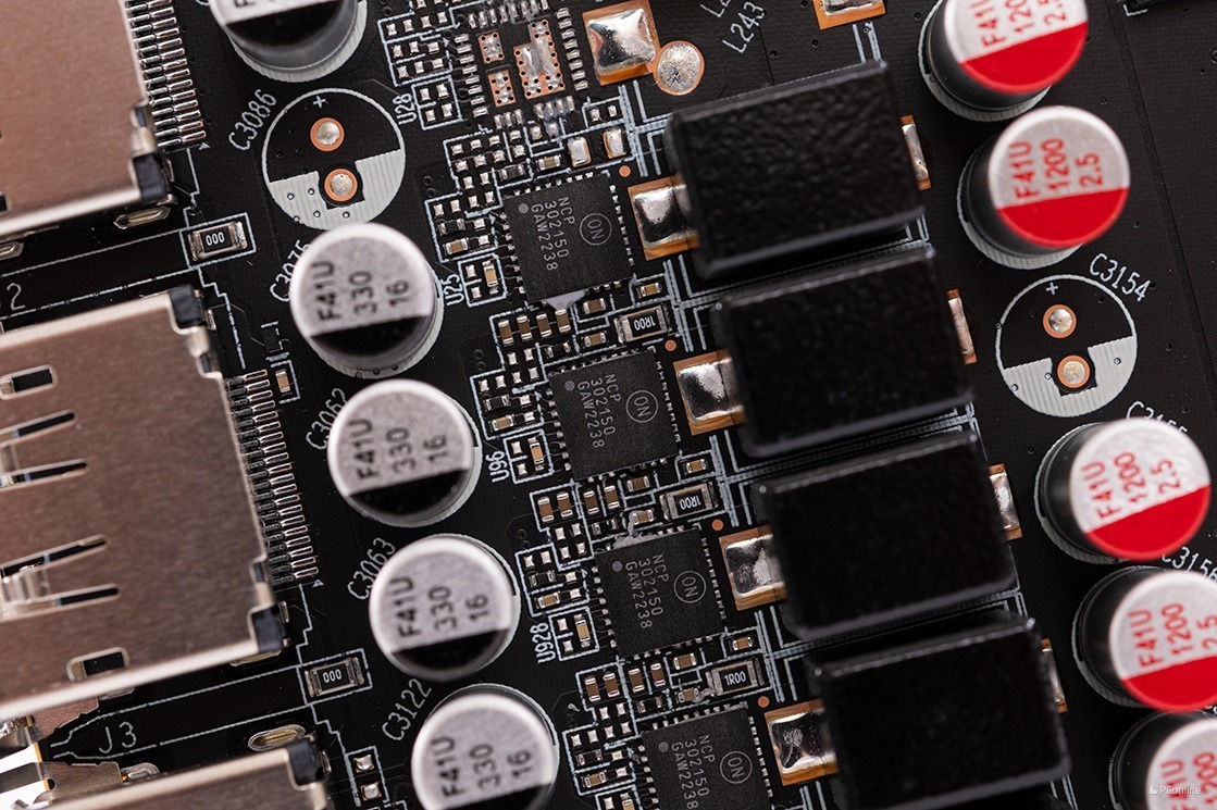 无论是核心供电还是显存供电都采用了独立的DrMos芯片,为NCP出品的302150 DrMos芯片,内建了上下两桥与驱动IC,持续最大输出电流可达到50A。