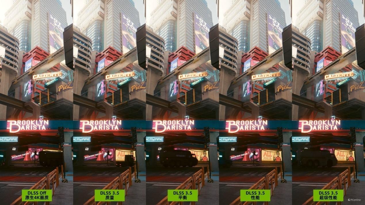 并且开启DLSS 3.5以后的画质也相当能打。这里我们也是录制了原生4K以及DLSS 3.5的四档画面在ICAT中进行画质对比,实测下来,即使开启帧生成以及光线重建后,画面用低分辨率超分渲染至4K,但在观感上与原生4K几乎没有任何差距,甚至文字细节上还要优于原生档。