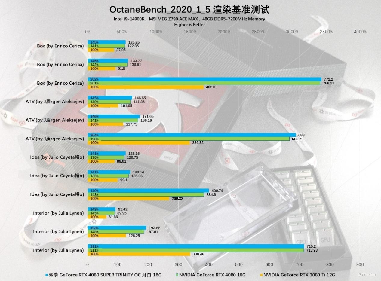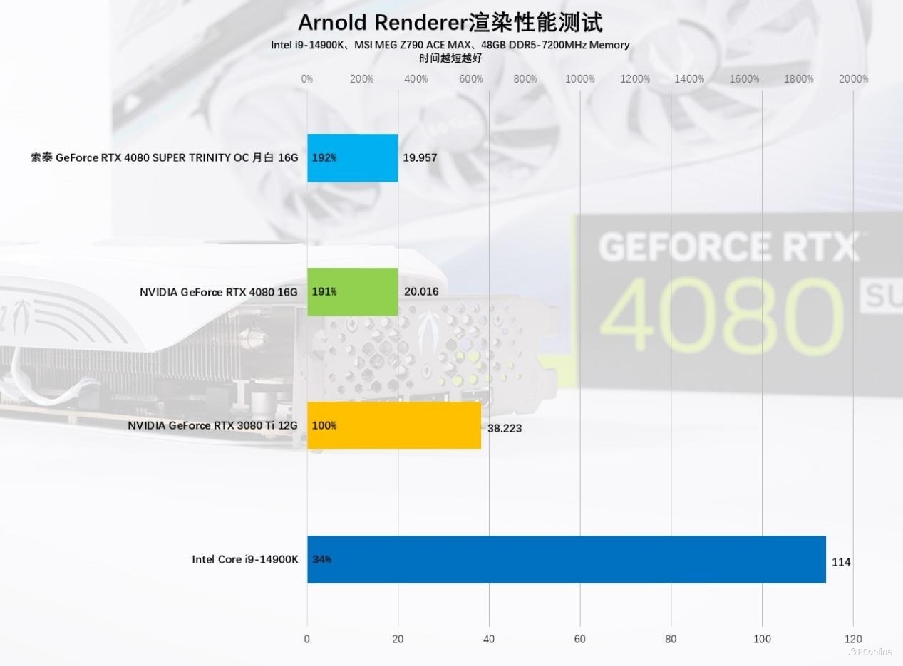 上点强度,Arnold渲染器,它是一个先进的蒙特卡洛光线追踪渲染器,主要用于电影和高端视觉效果制作。在这个软件里,索泰RTX 4080 SUPER TRINITY OC月白更是离谱,直接就是翻倍的性能提升。