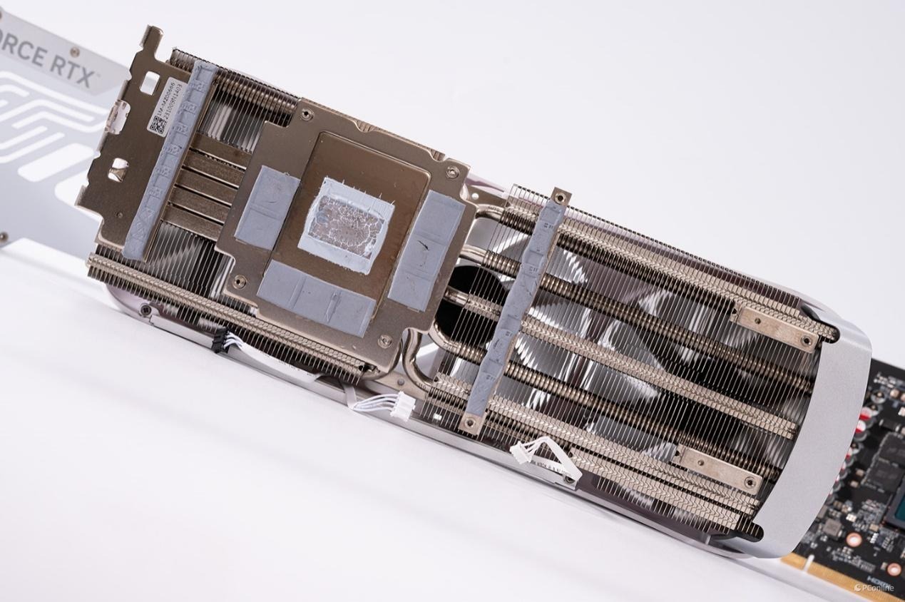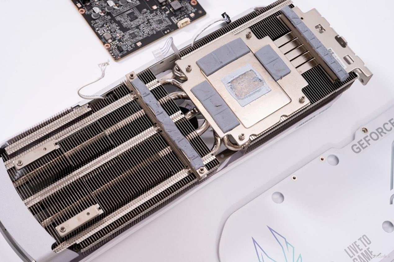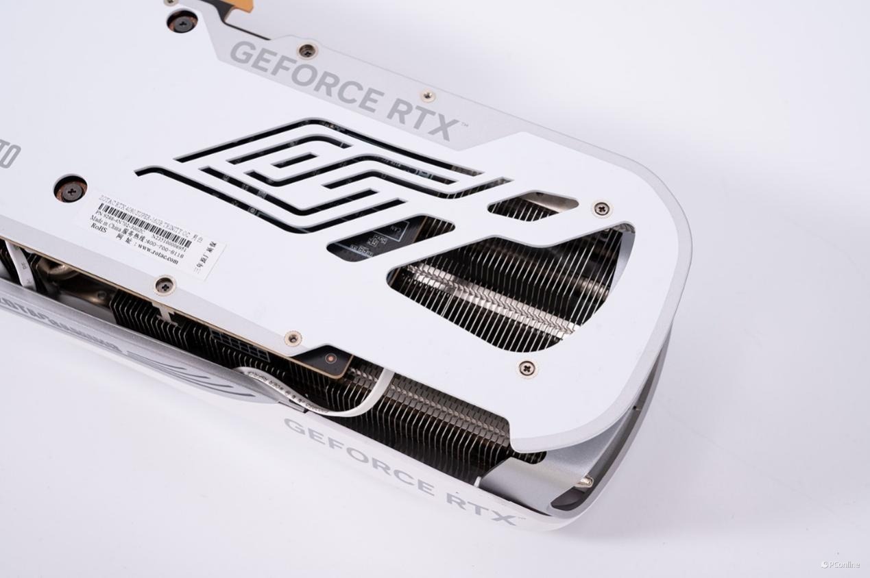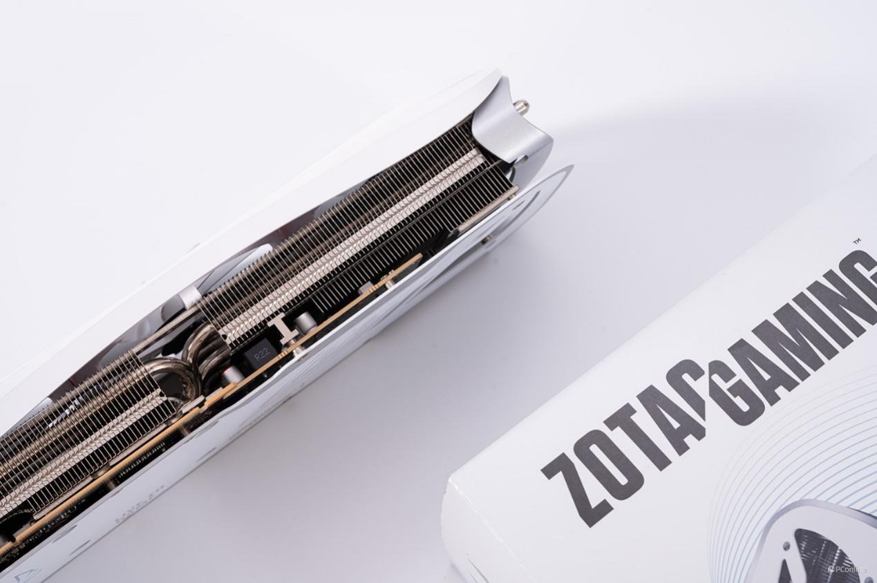 视角回到显卡底部,索泰RTX 4080 SUPER TRINITY OC月白拥有一整排密密麻麻的散热鳍片,透过鳍片看去,还能清晰见到内部错落有致的热管,想必散热堆的很给力。