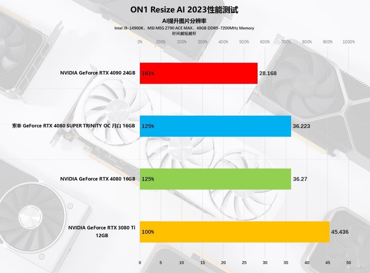 AI也经常被玩家用来放大图片,因此我们也是使用ON1 Resize AI 2023将5张图片提升200%分辨率,此时索泰RTX 4080 SUPER TRINITY OC月白的速度为平均7.2秒一张,而上代的RTX 3080 Ti为9秒左右,不过即便是SUPER后缀,其离老大哥RTX 4090还是有不小的差距存在。