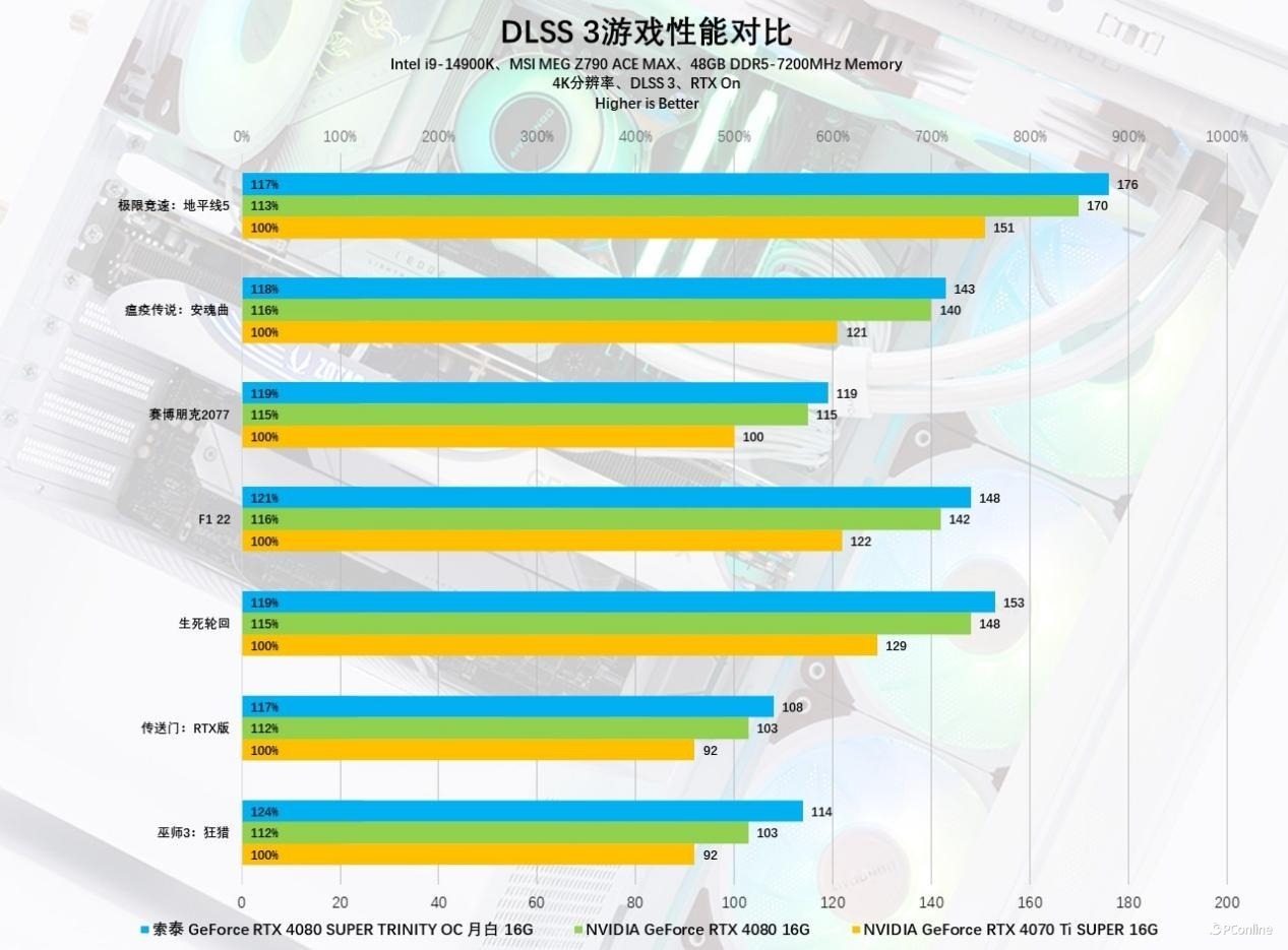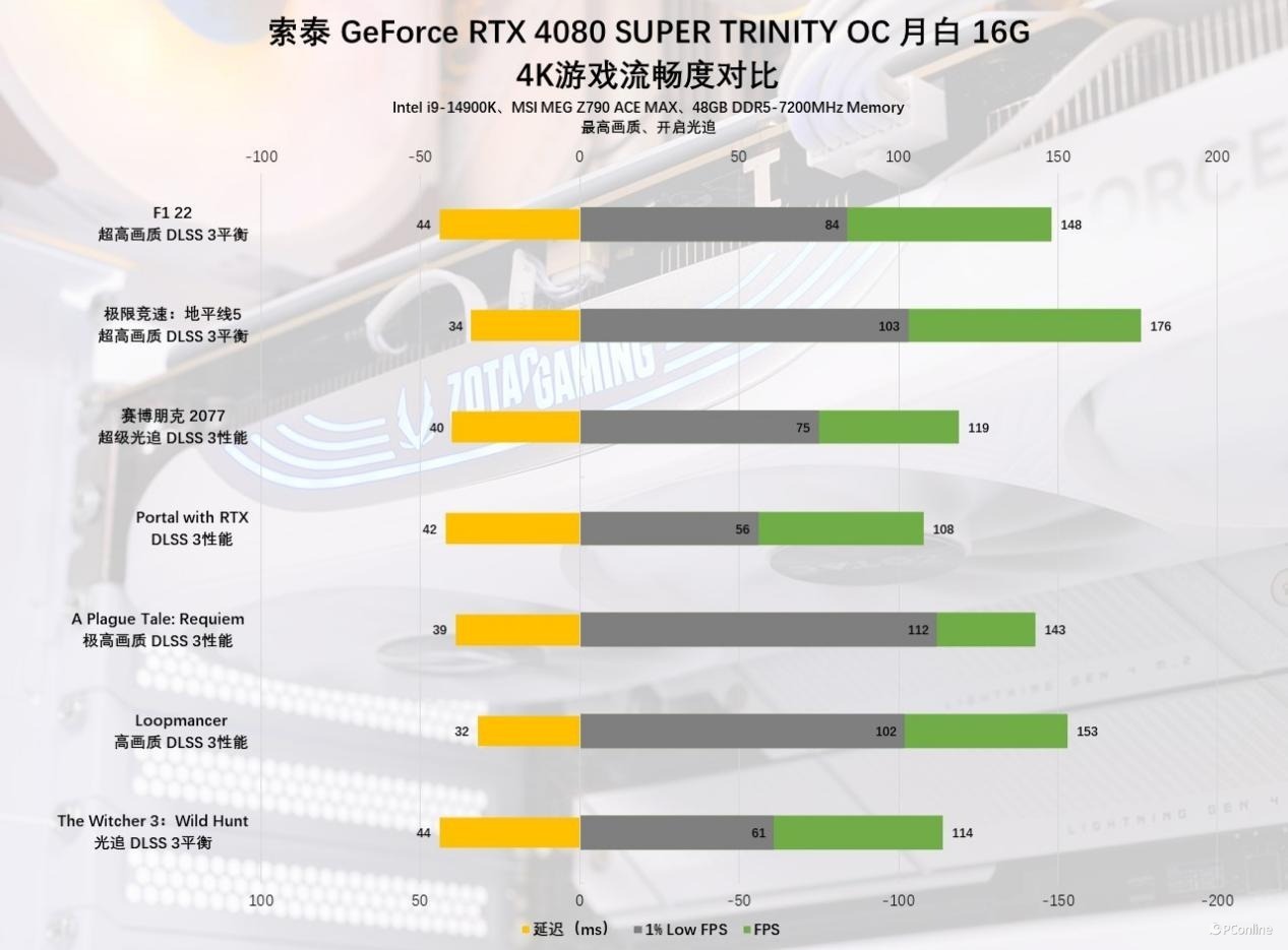 索泰RTX 4080 SUPER TRINITY OC月白在4K画质下的表现也相当亮眼,在开启DLSS 3后,大部分3A大作都能跑到120 FPS以上,基本满足了高刷游戏的门槛。