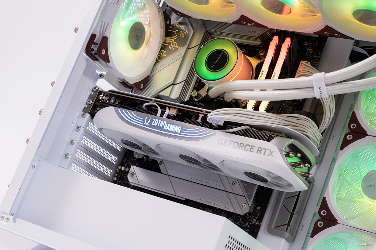 并且索泰RTX 4080 SUPER TRINITY OC月白的尺寸也比一般的RTX 4080 SUPER要小,5.9cm的厚度其实还好,越肩也不是很明显,选购机箱的时候可以在兼容性方面适当地留意一下就好。