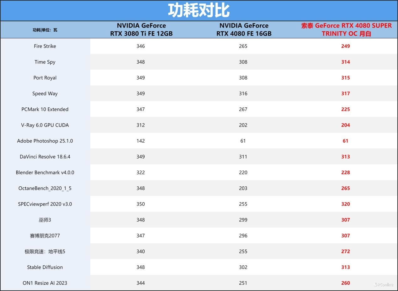 你仔细看就知道了,有些项目索泰RTX 4080 SUPER TRINITY OC月白的功耗甚至比RTX 3080 Ti低100多W,中间可以差出一整张入门级显卡的功耗表现。而与RTX 4080相比,两款显卡则差不多,毕竟用的同款核心。