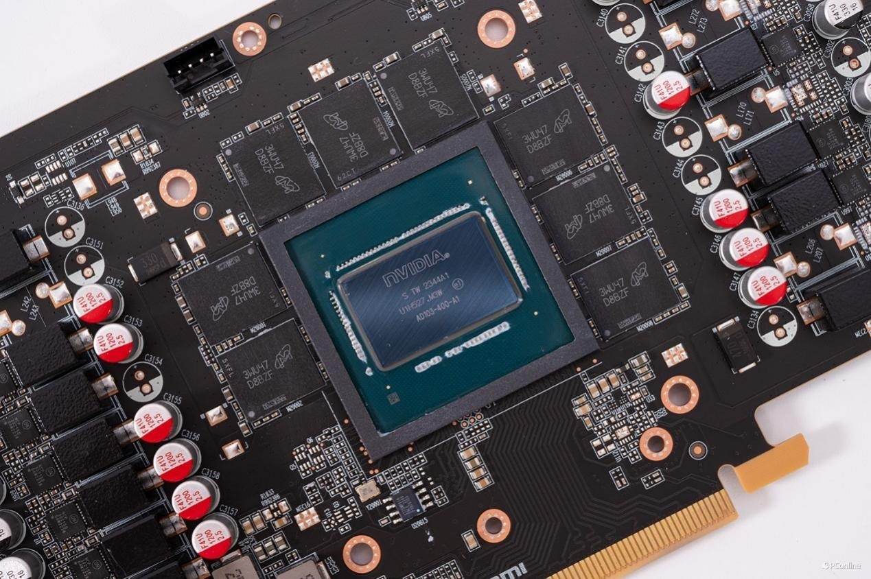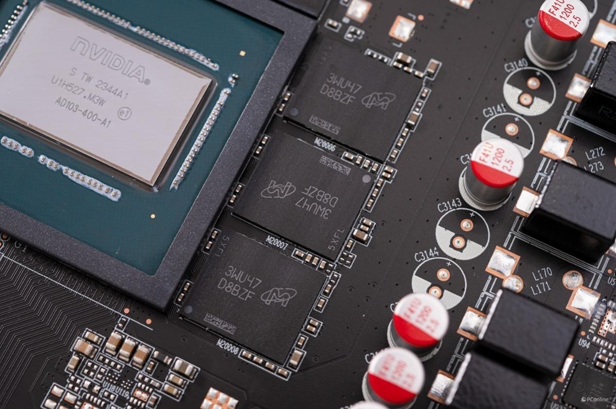 核心的四周是8颗GDDR6X显存,由美光与NVIDIA联合研制,型号为3WU47 D8BZF,单颗显存容量2GB,8颗组成16GB,显存位宽为256Bit,并且这是目前RTX 40系里最快的显存,其显存速率可达到23Gbps,比老大哥RTX 4090还高。