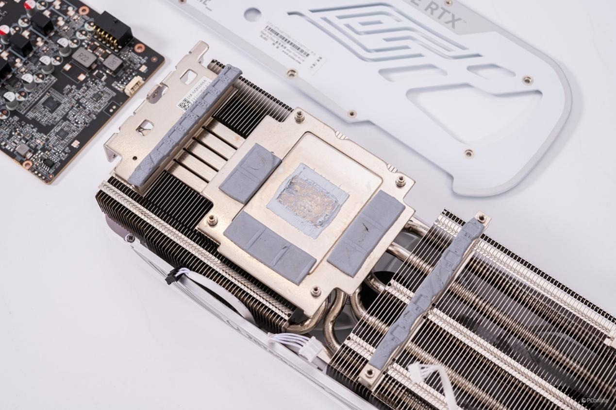 拆开后可以看到超大面积的镀镍纯铜底,这款显卡的显存通过高导热系数的导热垫直触铜底,散热表现出奇的优秀。同时显存、电感、Mos管处还有高系数的导热垫填充硬件与均热板间的空隙,有助于高效导热。