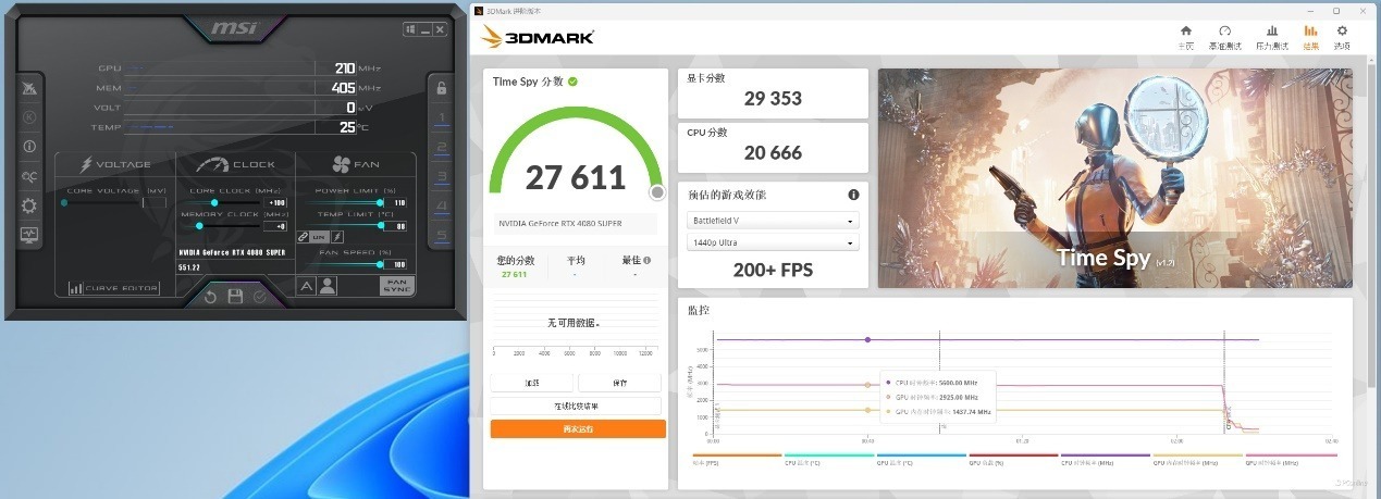 首先对这张卡的性能有个基本的了解,索泰RTX 4080 SUPER TRINITY OC月白在全默认的状态下,Time Spy得分28593分,有一说一这个表现已经相当出色了。