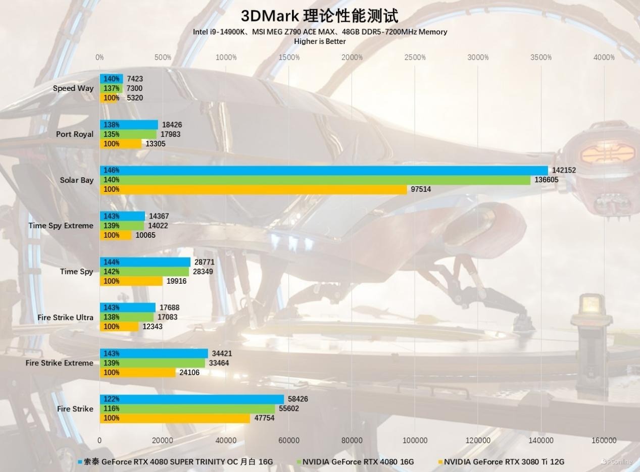 首先看3DMark,索泰RTX 4080 SUPER TRINITY OC月白的表现那是真的没得说,以DX11为代表的Fire Strike系列测试里,这款显卡的性能能够超越前代RTX 3080 Ti 30%以上,而在以DX12为代表的Time Spy测试中,索泰RTX 4080 SUPER TRINITY OC月白更是离谱,领先幅度已经拉开到40%以上,可见这代显卡彪悍的性能释放。面对RTX 4080的话,这款显卡则也能有3-5%的性能优势。