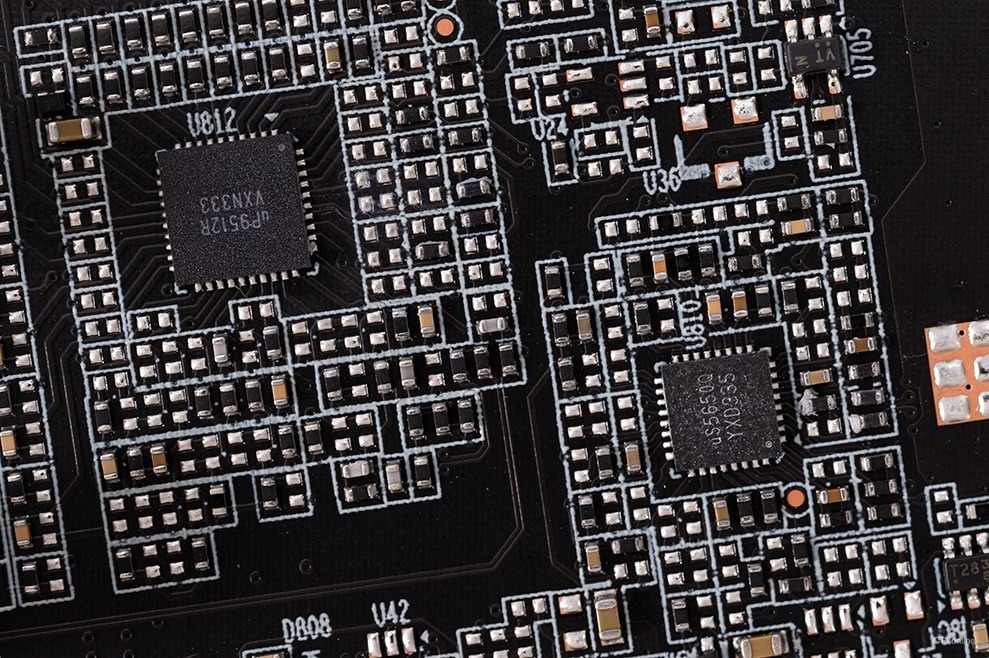 PWM供电芯片则被安排在PCB背面,型号为uP9512R和uP9529Q,用于同时管理核心供电金和显存供电。其附近还有一颗名为uS5650Q的芯片,担任电压/电流/功耗监控的工作。